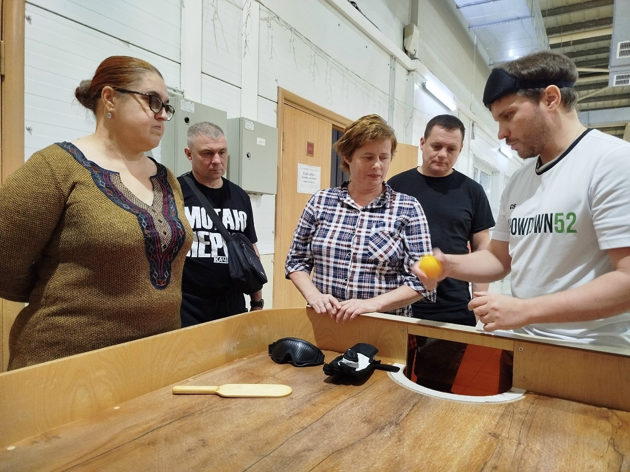 Средства: стол с разделительной перегородкой и высокими ботами, звонкий мяч, защитные перчатки, ракетки и тёмные маски для глаз (для создания равных условий для всех).